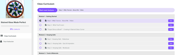 Your courses are available to view online on my Everything Stained Glass School which is on a platform called Teachable.