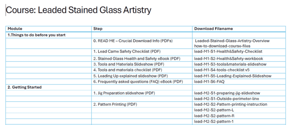 - What does the downloaded course look like? – I have kept the structure the same so all files are named according to Module and Step. Plus I have included an Overview of the course contents and corresponding file names in the course overview document in Step 0 and in the zip file. See examples below: