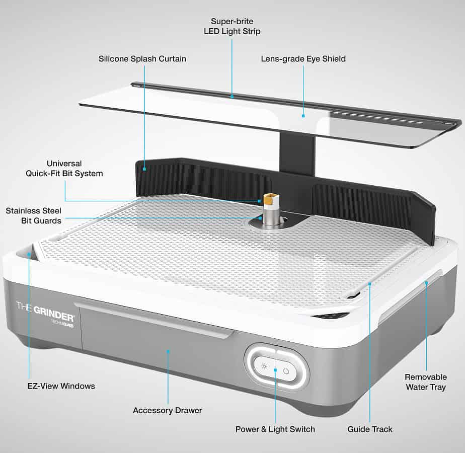 The second is The Grinder 2 (paid link). This is smaller, cheaper and more suitable for hobbyists or those with less space. The cheaper price is reflected in terms of features – no light or shield, no mini surface or large splash shield. You can order these items separately if you want.
