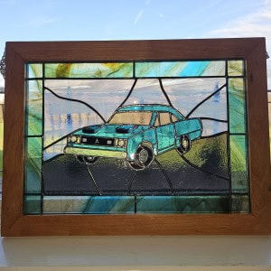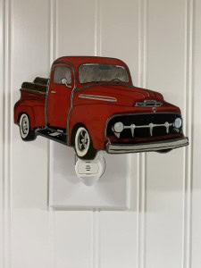 Thank you, Ray! The little truck is made of only three pieces of glass, and on that all the details are carefully painted in layers to make all the details based on a photo of the truck. For the windscreen, for instance, I did an outline of it with a black Pebeo paint pen, baked on for permanence. Then inside that a layer of white, baked again. Then on that the dark parts (rear view mirror, steering wheel, things like that), baked again. Then over that a faint layer of gray painted at a diagonal to give the impression of light reflection. Thin white lines at the top for reflection, then baked a final time. Time consuming but fun! I use all Pebeo 160 paint and paint pens – the pens help with fine lines.