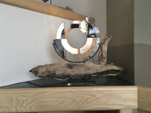 The metal is a half circle frame on legs that you can buy in several sizes at a lot of online glass stores. Some are more sturdy than others.. I cut the legs off in the middle and put them into the driftwood- half in the top and half through the bottom
